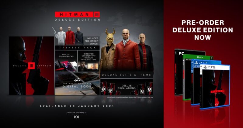 Le edizioni fisiche Standard e Deluxe di Hitman 3 sono prenotabili. Chi prenoterà un’edizione qualsiasi del gioco presso i rivenditori aderenti riceverà il Trinity Pack, che include 9 oggetti in gioco come abiti, valigette e armi dell’intera trilogia del mondo dell’assassinio.