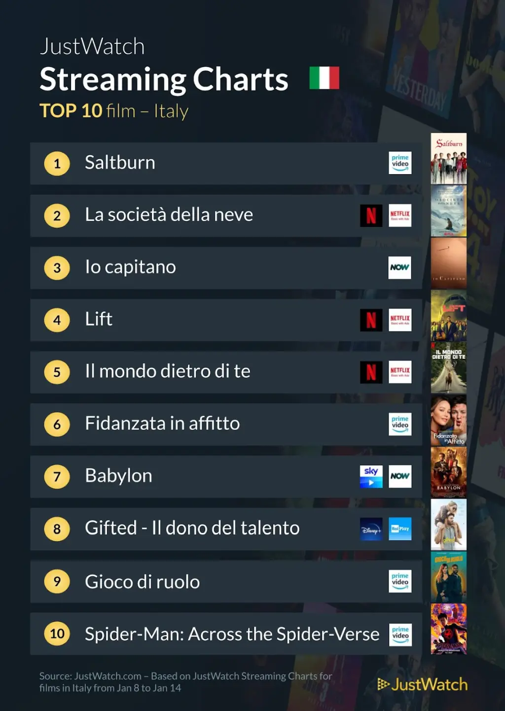 Parliamo di Saltburn, thriller di Emerald Fennell che svetta al primo posto, e del film di Juan Antonio Bayona La società della neve, che racconta dello spaventoso disastro delle Ande accaduto nei primi anni ’70, posizionato fermamente in seconda posizione.