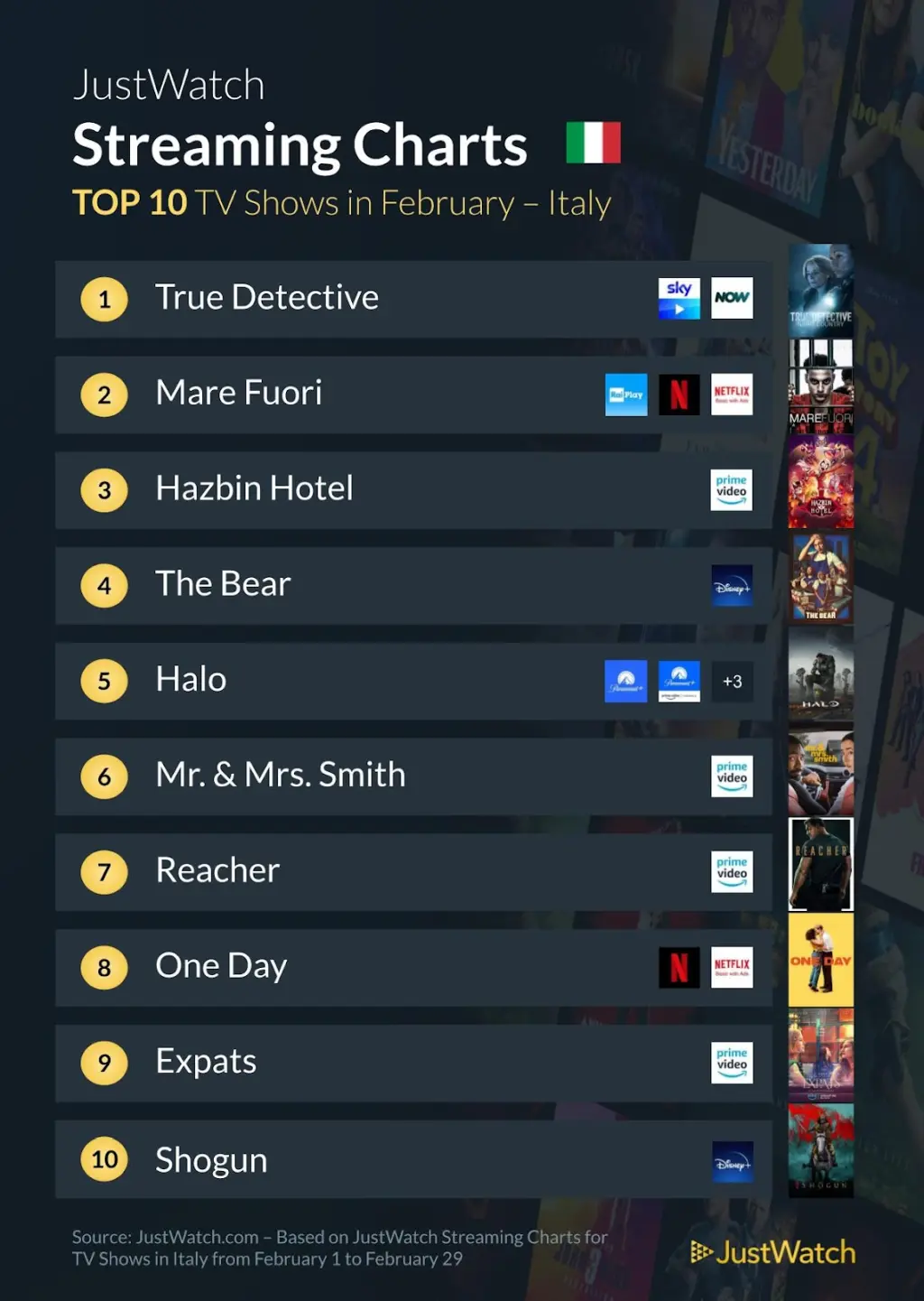 La top ten relativa a film e serie televisive del mese di febbraio 2024 riserva alcune sorprese riguardo le serie TV più viste in assoluto, mentre si ravvisano titoli meno particolari dal lato delle visioni relative all’ambito cinematografico.
