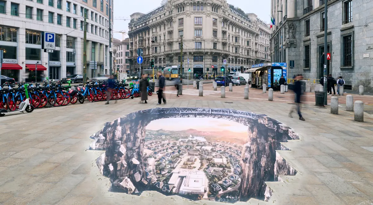 L’opera, firmata dall’artista Fabio Giampietro, è visibile in Piazza Missori fino all’8 marzo 2026 e crea una suggestiva illusione ottica che sembra aprire una breccia tra il mondo reale e il bunker sotterraneo della serie.