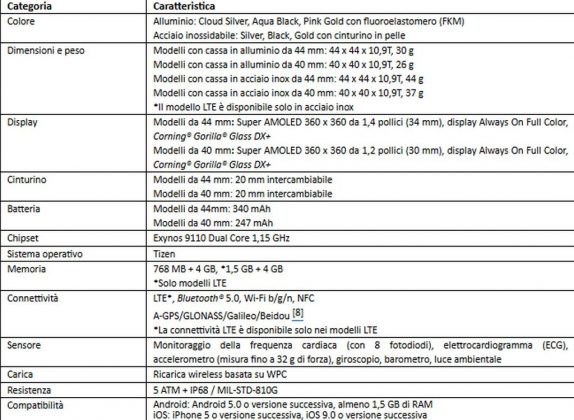 Lo smartwatch è disponibile in due diversi formati (44 mm e 40 mm di diametro) e due stili: alluminio leggero con fascia in fluoroelastomero (FKM) e acciaio inox con cinturino in pelle. Gli smartwatch possono essere personalizzati con una gamma di eleganti opzioni aggiuntive per cinturini e quadranti.